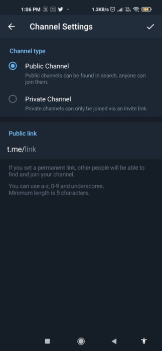 5. When creating a public channel, you will need to come up with a public link (unique), whereas a private channel will give you an invite link.