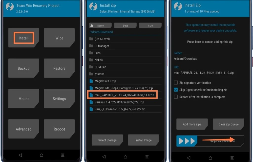 4. Go back to the main menu and select Install . Find and select the MIUI 14 file you downloaded and select the Swipe to confirm Flash option.
