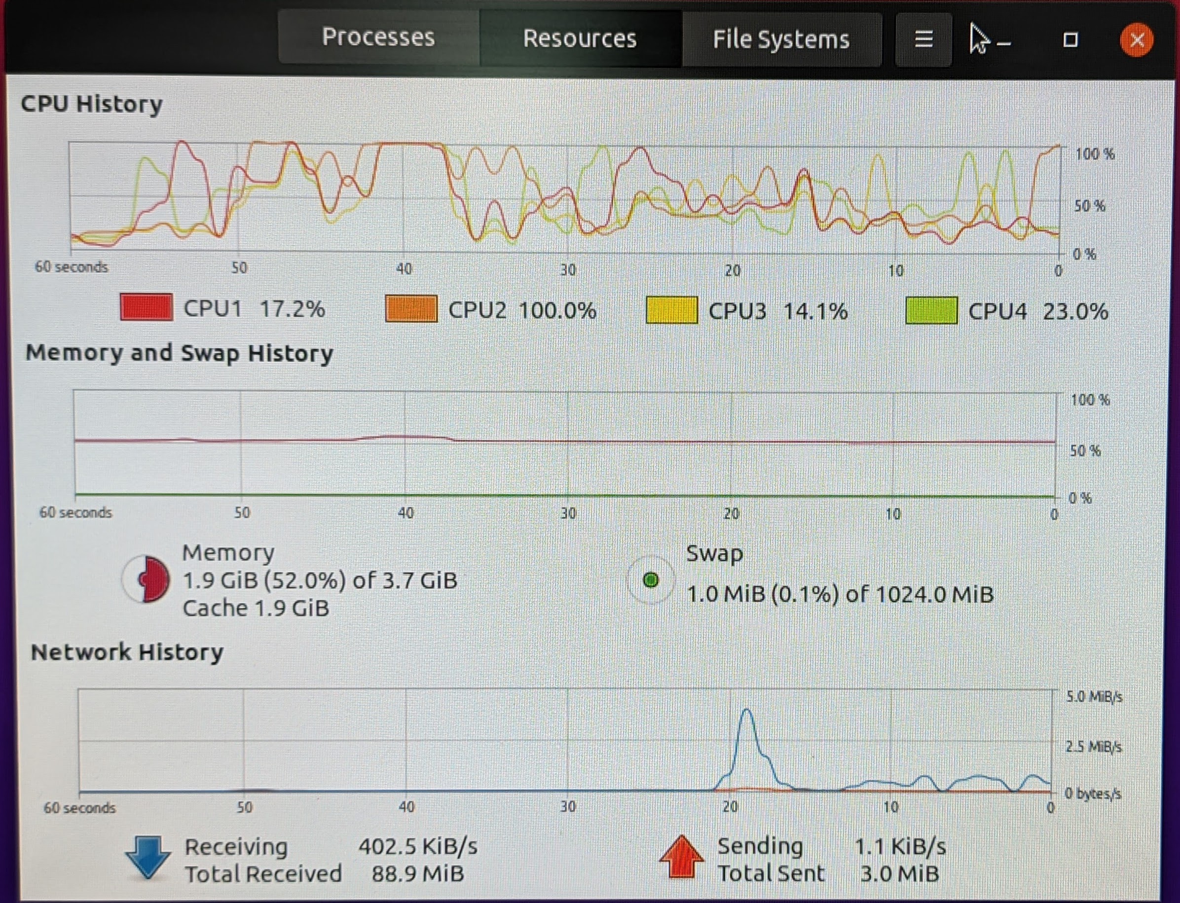 While idle, Ubuntu consumed over 1.2 GB of RAM. After firing up two Chromium tabs, app store, and two instances of the terminal, the average memory consumption bumped over 3.2 GB, and the Pi started lagging. However, the peak temperature never crossed 52℃, thanks to the fan accessory that I got in the kit.