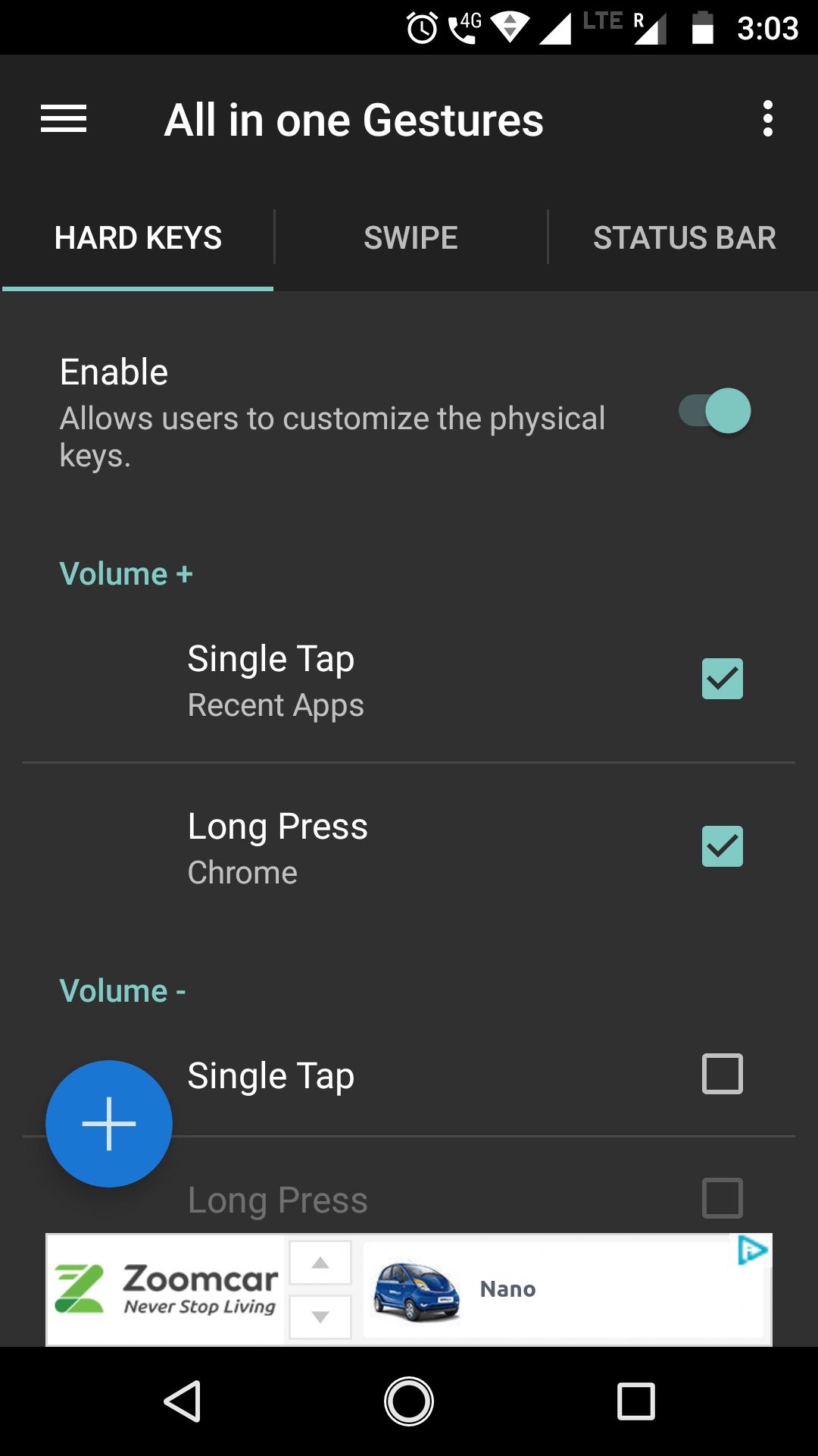 There the three categories of gestures offered by the app. You can customize the physical keys of the device to open apps, shortcuts, and navigate to different screens. For instance, you can set the volume up button to open the music player when you long press it.