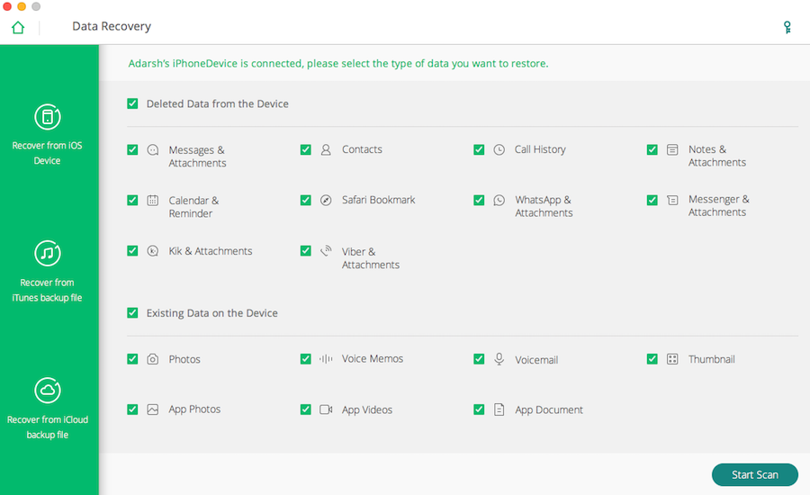 As you’ll click on this button, you’ll be shown three options — Recover from iOS Device, Recover from iTunes backup file, and Recover from iCloud backup file. These options will be shown in the left pane. On the right side, you’ll see different kinds of data that you can scan for. After choosing the correct options, you need to click on the Start Scan button in the right bottom.