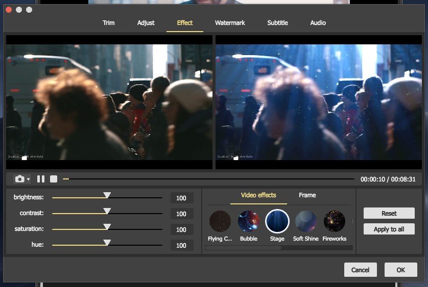 Below that, there’s an Edit icon as well that makes sure that you don’t need any video editor to add effects, filters, watermark, subtitle, etc. You can also adjust the brightness, saturation, contrast, etc.