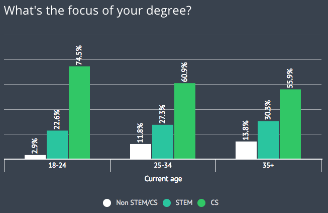 A similar trend is also observed in the gender gap in age of learning to code. Today, there is just 7% gap between men and women who started coding before they were 16 years old. Earlier this difference was 20%.