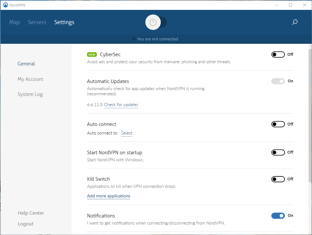 Head over to the Settings section; you will find various toggle buttons for notifications, turning on NordVPN at Windows startup, start minimized, etc. CyberSec is a new addition that NordVPN says it can remove phishing and other malware-related threats while you use their VPN service.