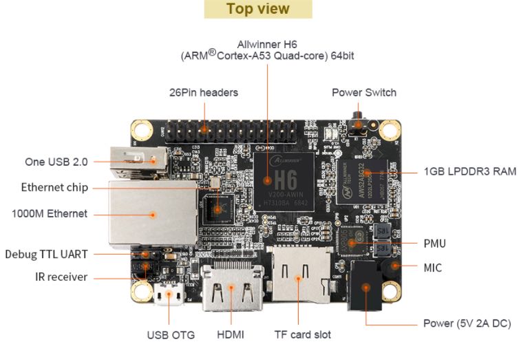 The most important feature of this device is the brand-new SoC — Allwinner H6 V200 quad-core Cortex A53 processor with Arm Mali-T720MP2 GPU. This processor is designed for Gigabit Ethernet, USB 3.0, PCI interfaces, etc. However, with Pi One Plus, you only get one USB 2.0 host port and microUSB for power. You can also power it via 4V/2A DC power barrel jack.