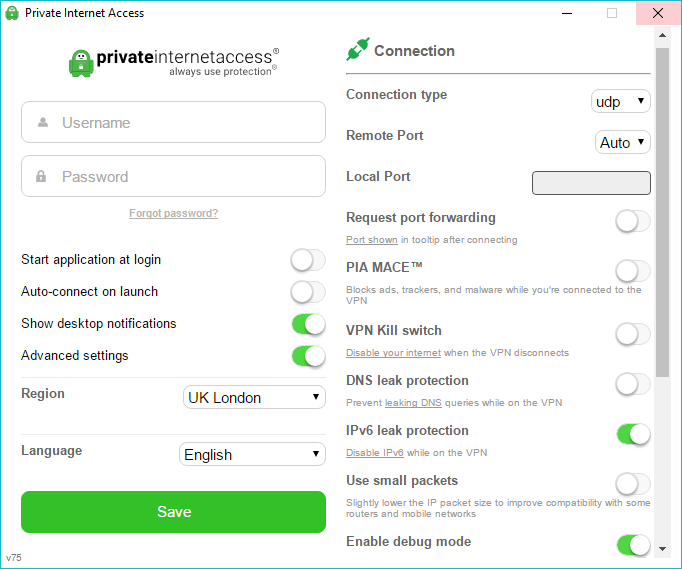 You can also enable and disable other features such as VPN Kill Switch, DNS Leak Protection, IPv6 leak protection, etc. The app can also reduce the size of data packets to improve compatibility with a wide range of routers, possibly older ones. The ‘Enable debug mode’ option allows the PIA to gather data about performance, attempts to connect to the VPN, and save it to a local log file.