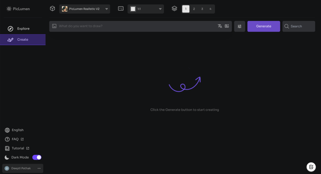- Generate the Image: Once you’re happy with your description and settings, click “Generate.” PicLumen will turn your text into a unique visual image you can use or share immediately.