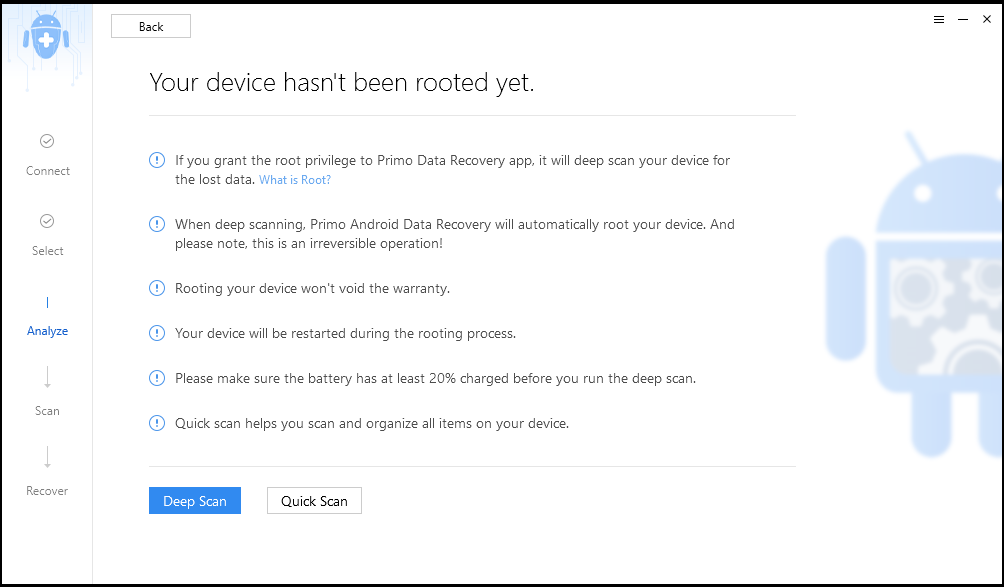 On the next screen, you can choose whether to perform a Deep Scan or Quick Scan. Much like other software Primo Android Data Recovery also roots your device to perform Deep Scan. But it incorrectly states that rooting your device won’t void your warranty.