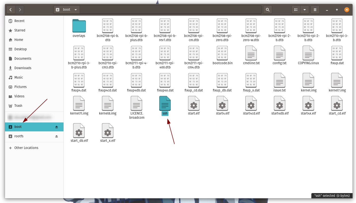 - After opening the home partition, create a new text file and name it ssh . During the boot, Pi searches for an SSH file, and if it’s found, SSH is enabled, and the file is deleted