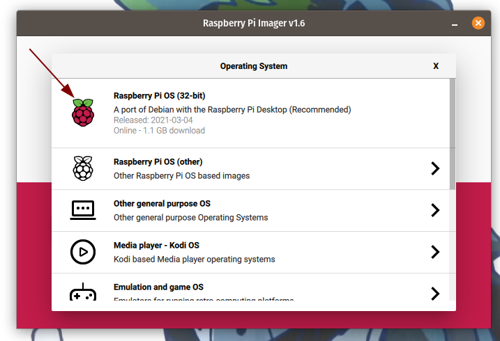- From the list of OS, options find Raspberry Pi OS on the top and select it.