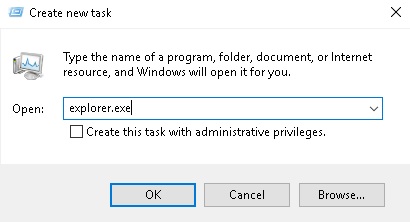 - On Task Manager, go to File > Run new task. Type e xplorer.exe and press enter.