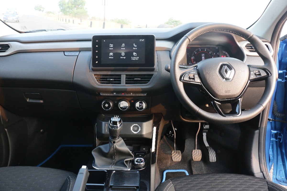 We have to say that the interior of the Kiger surprised us and it feels better built than the Nissan Magnite, another SUV which is also built on the same platform as the Kiger. The design is suitably premium, and it goes for an all-black look which is again another hint towards its sportiness. The interior shares more with the Triber but compared to that car, the Kiger is more luxurious! There is gloss black on the steering wheel and center console, and there is an 8-inch touch screen and a digital TFT instrument cluster. Some nice touches are the switches for climate control which are well finished!