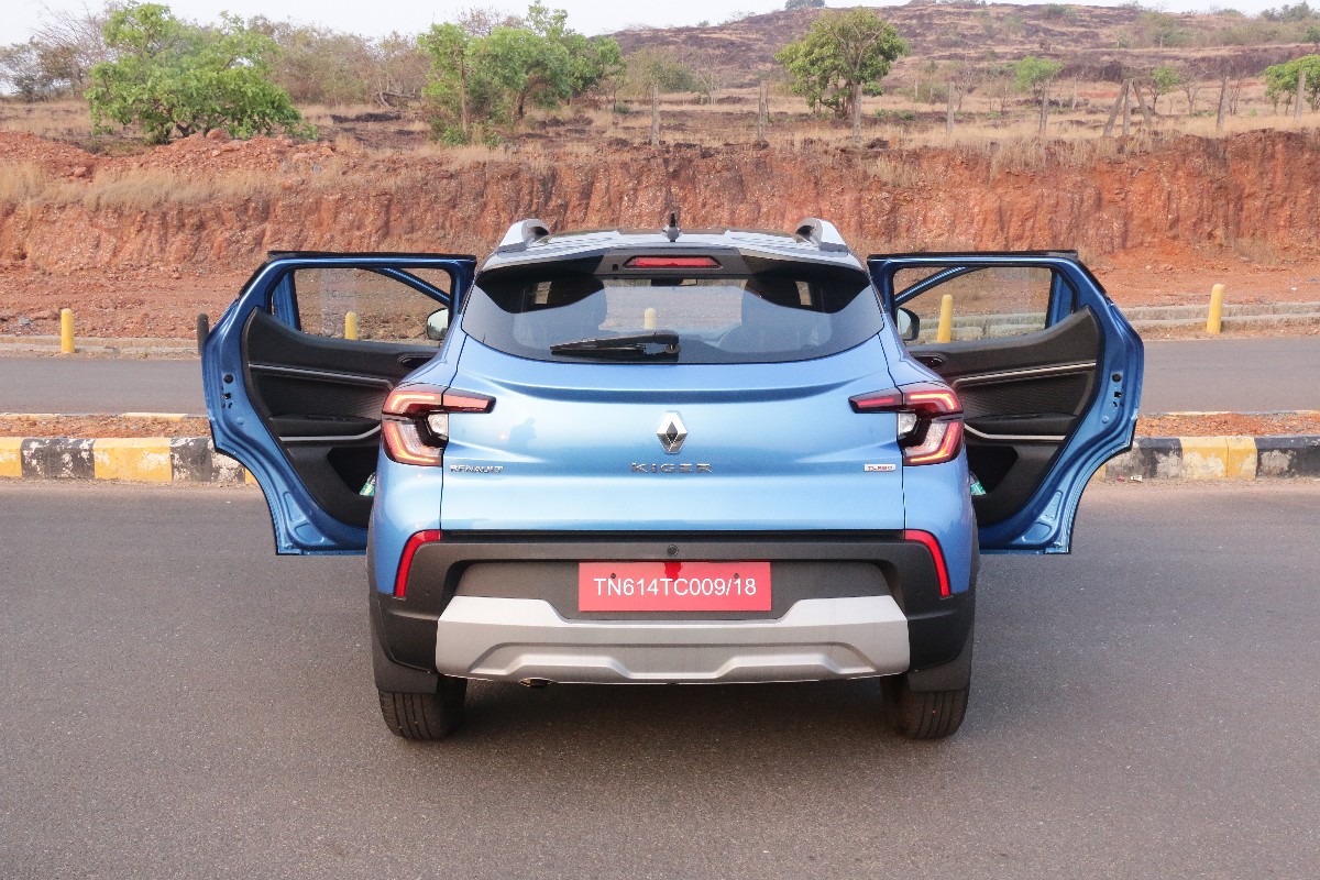 Absolutely! Kiger surprised us how it can squeeze out so much space inside its compact size and it’s all down to the platform it uses. The seats are a bit thin but offer decent comfort but the real deal is the space between them. Renault says that there is a 710-mm Couple Distance between seats while to us the cabin does feel airy. The rear due to the sloping roof feels a bit compact initially but the sheer space inside at the rear seat is very good. Legroom is excellent as is headroom plus you can squeeze in a middle passenger with a flat floor (nearly). The 405l boot is also the biggest! Further on, we liked the center armrest storage which holds 10.5l and the door pockets can hold 1l bottles.