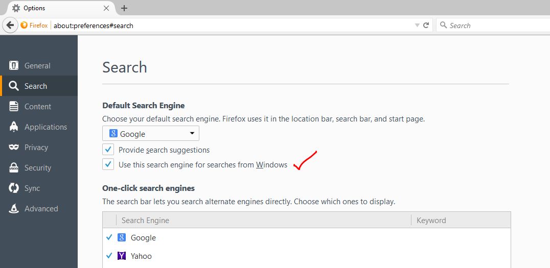 How to change Windows 10 desktop search using Firefox 40?