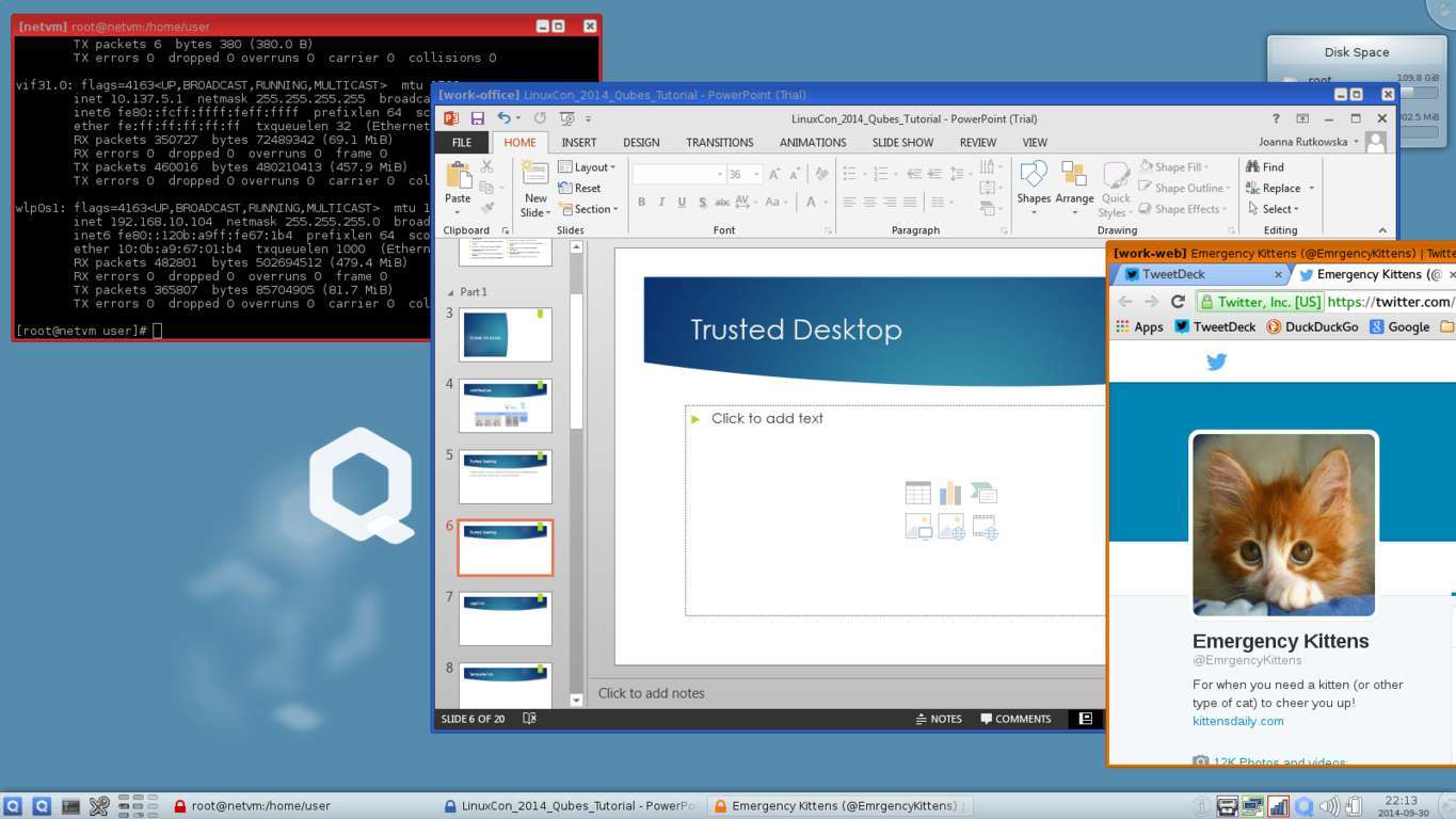 In Qubes, the isolation is performed by turning hardware controllers into functional domains. It also separates your digital life in different levels of trust, for e.g., work domain, shopping domain, random domain, etc. All these domains are run in different virtual machines. With this technique, one exploit doesn’t allow the attacker to take over the entire computer.