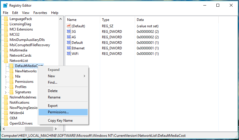 For DefaultMediaCost, you will see multiple registry entries. You need to change the value of Ethernet to 2 (means metered) from 1 (means non-metered). It’ll show an error if you don’t have the permission to edit the value.