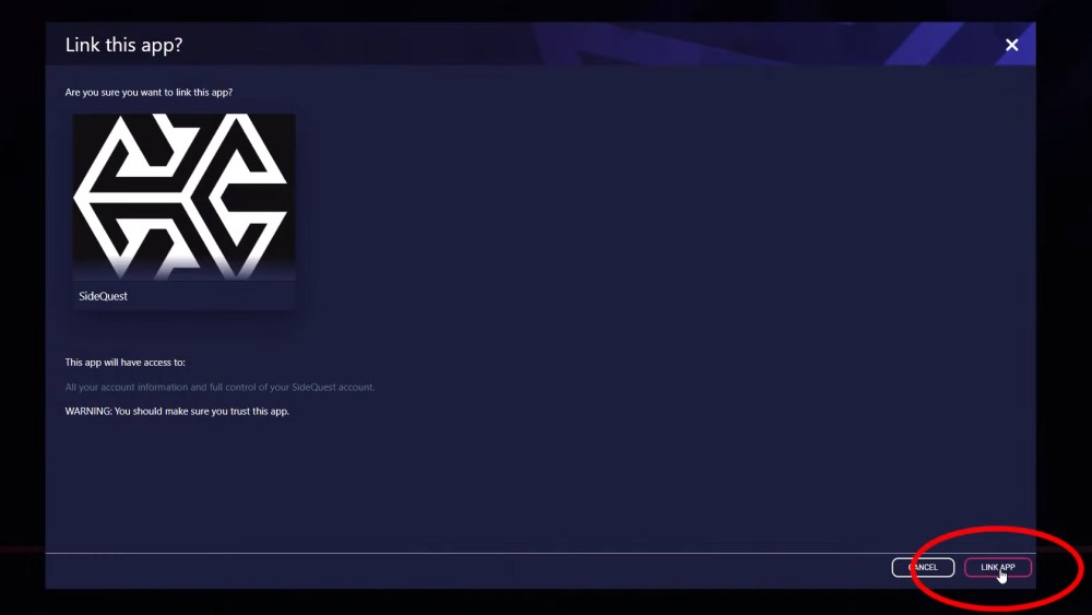 Open the Sidequest VR app on your Quest 2 by going into Unknown Sources. Note down the 6-digit code shown on your screen and enter it on this link ( sdq.st/link ). Once you have entered the code, a pop-up window will appear. Click on Link App in the bottom right corner.