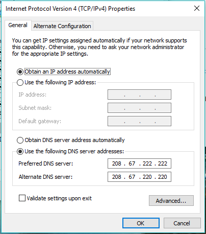 Alternate DNS server: 208.67.220.220