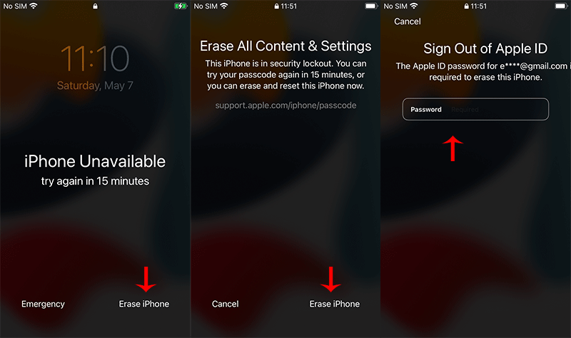 Step 1: The iPhone unavailable screen appears when you enter the wrong passcode five times. You can see Erase iPhone option in the bottom right corner of the screen. Tap on it and then tap Erase iPhone again to confirm the operation.