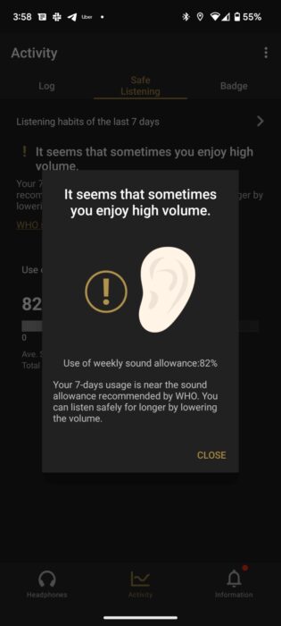 I’m not sure if the Safe Listening feature is exclusive to the WF-LS900N, but it does a great job of reminding you when you’re way above the recommended listening sound pressure. It calculates the average decibels and shows whether your 7-day usage is near what WHO recommends. Very cool. Overall, I’ve had no issues using the app. Also, if you’re on Android 13, the battery widget works.