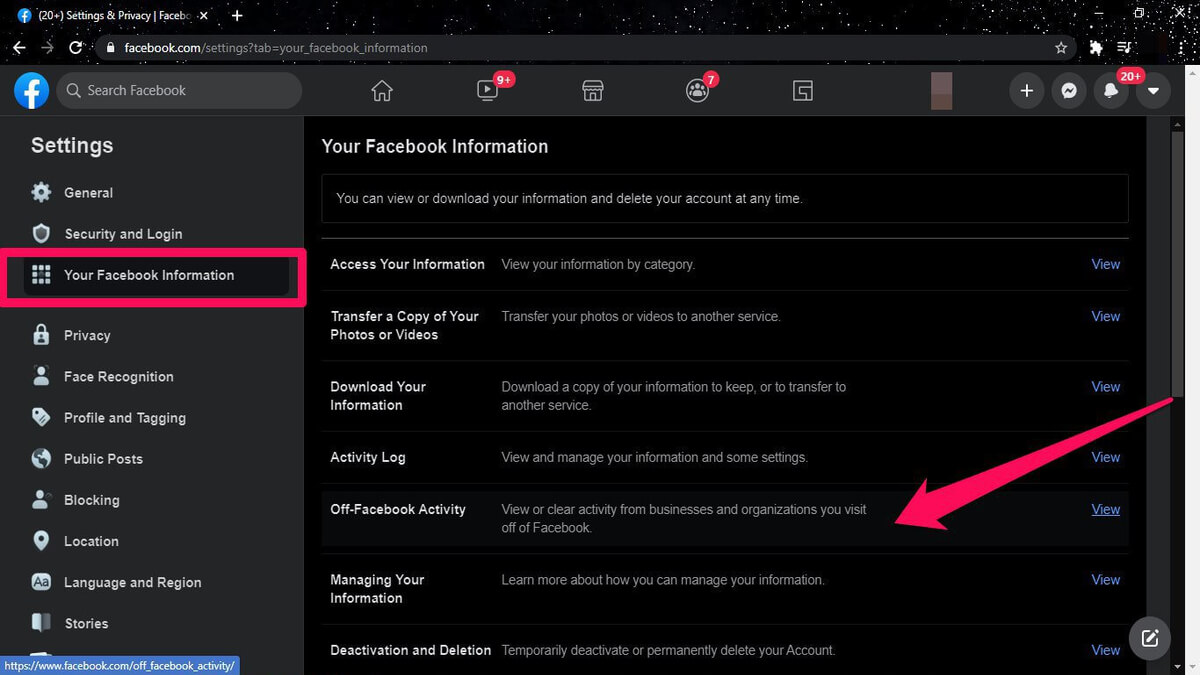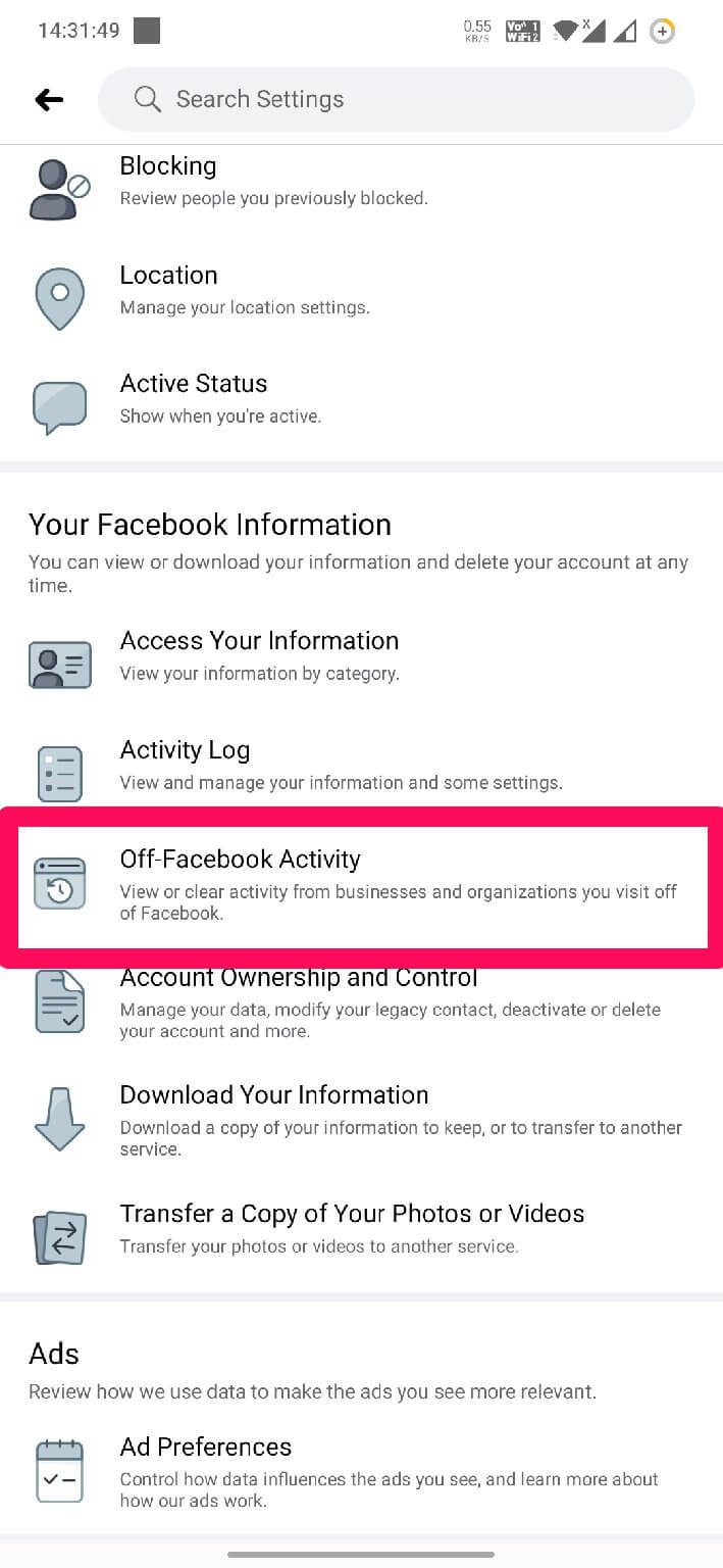 Click on “Your Facebook Information” and then choose “Off-Facebook Activity.”