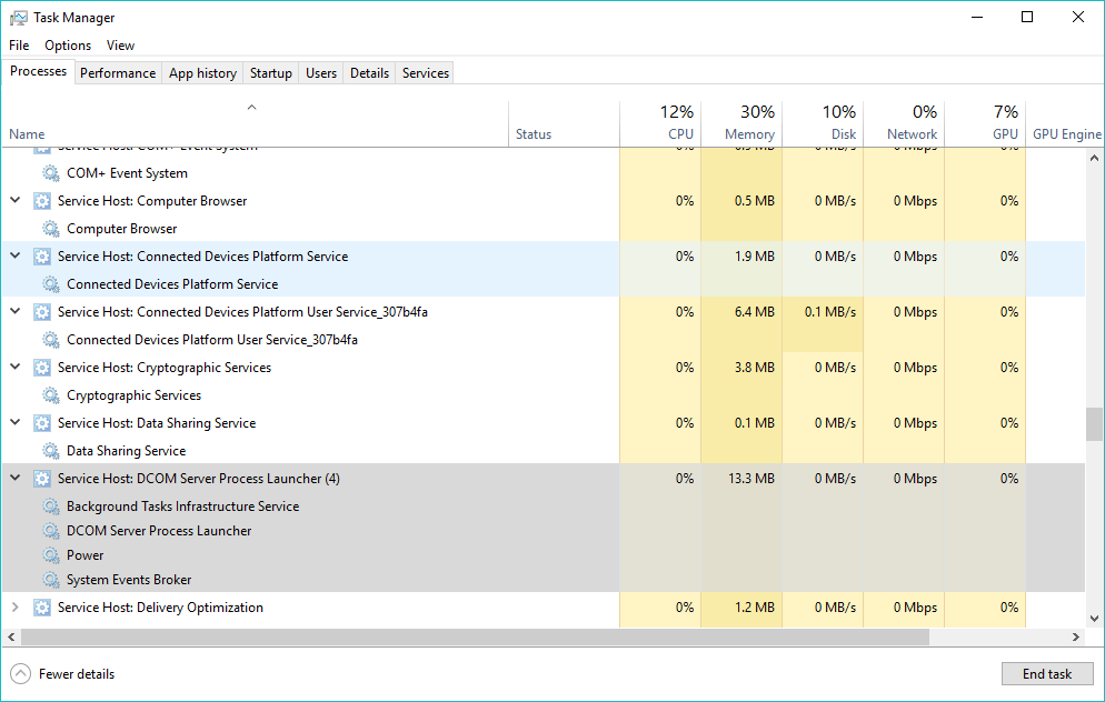 Some users have also reported memory leak problems like 100% CPU usage on their PCs. Due to some reason, the Svchost process starts gobbling memory on the machine to the point that it starts to slow down. You can spot such svchost.exe instances in the Details tab, look for high usage in the Memory column for a service.