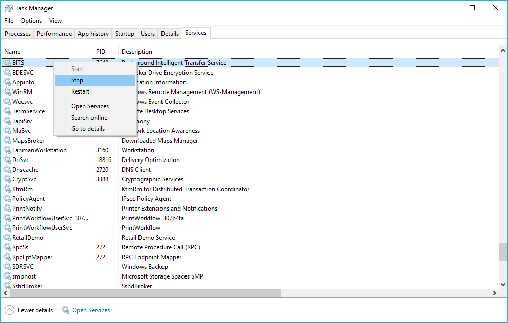 You can stop BITS services by going to Task Manager > Services > Right-click Background Intelligent Transfer Service (BITS). Now, click Stop . Doing this will stop the download.