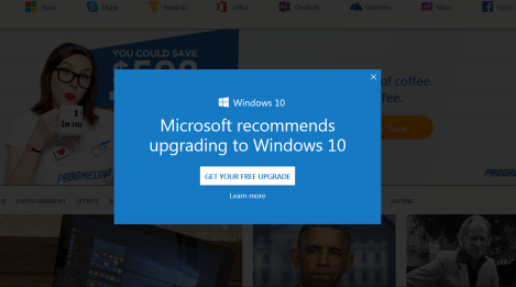 Other users have already complained that they have been seeing giant Windows 10 pop-ups that prompt them to upgrade Windows 10 when they MSN.com — all this without installing the new IE11 security update. I’ve tried to reproduce this behaviour on my spare Windows 7 PC but failed to do so.
