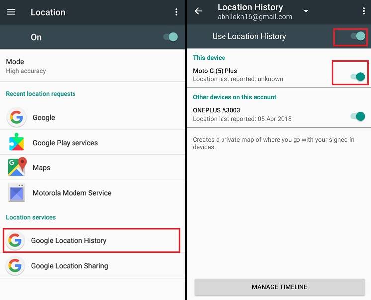 5. Toggle to switch on the option next to Use Location History . Also, toggle the switch next to your device name to On position.