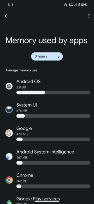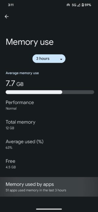 As the name suggests, this option allows users to check the average memory usage on the phone by various apps. Additionally, users can also customize the time frame and review the average usage per app by accessing the “Memory used by apps” section.
