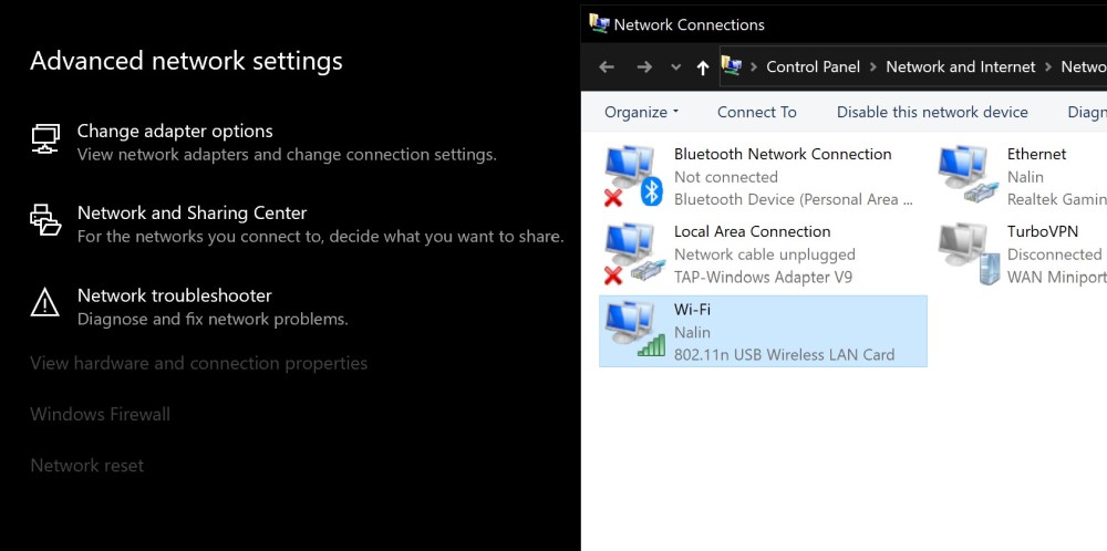 2. Click on the Change Adapter Options and a pop-up menu will appear.