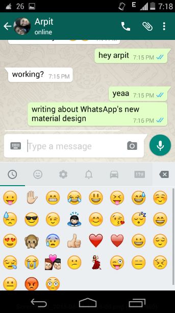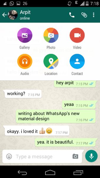 In the new WhatsApp with material design, there is a new animation-styled theme that gives this instant messaging app a new look and feel. The updated app has new icons, color-filled emoticon tray and the all new voice calling feature. After the update, calls, chats and contacts are merged with app’s taskbar in a single color.