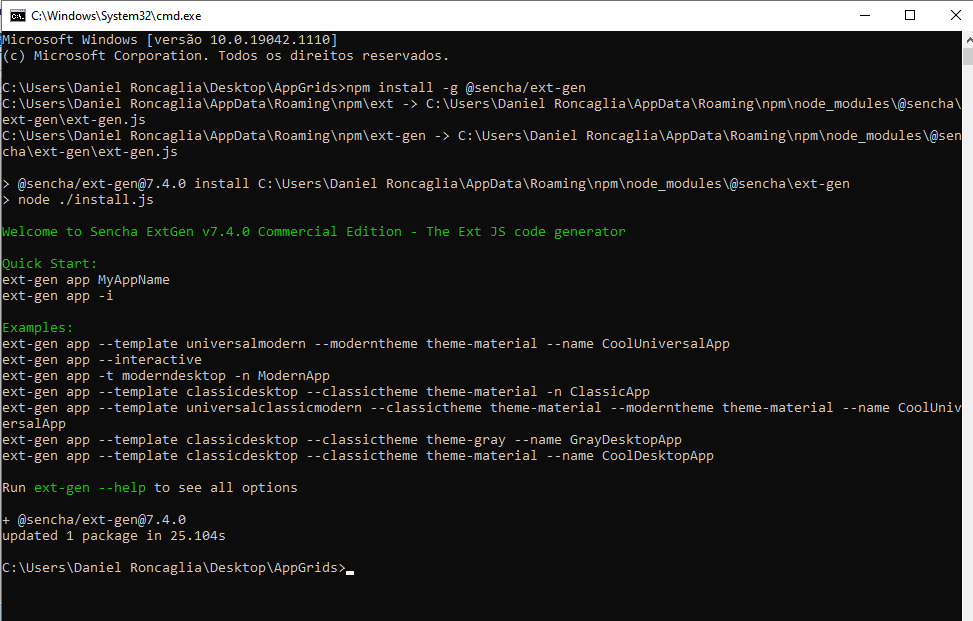 With the Ext JS Sencha package installed, the following command allows you to create a project with a simple home page view and a grid.
