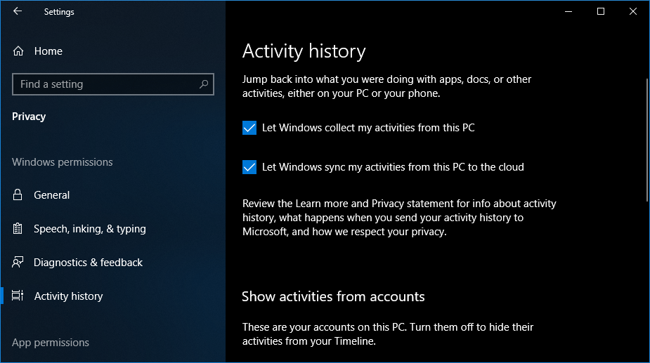 In Windows 10 April Update, Activity History is more visible in the form of a new Settings page in the Privacy section. There you can disable the feature or prevent Windows from syncing your activity history to the cloud.