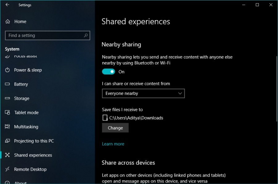 As the wireless file sharing feature is just introduced, the options related to it are somewhat limited. Still, you can head over to Settings > System > Shared Experiences to see what’s available. There you’ll find the radio button to enable or disable nearby sharing. You can also put a limitation on what devices can establish nearby sharing connections with your PC.