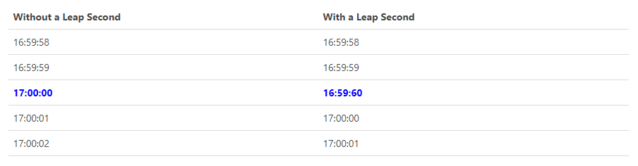 The above is an example of a positive leap second. Increasing the confusion, the concept of negative leap second also exists where 1 second is removed from the day and the seconds will be counted from 0 to 58. But a negative leap second has never occurred.