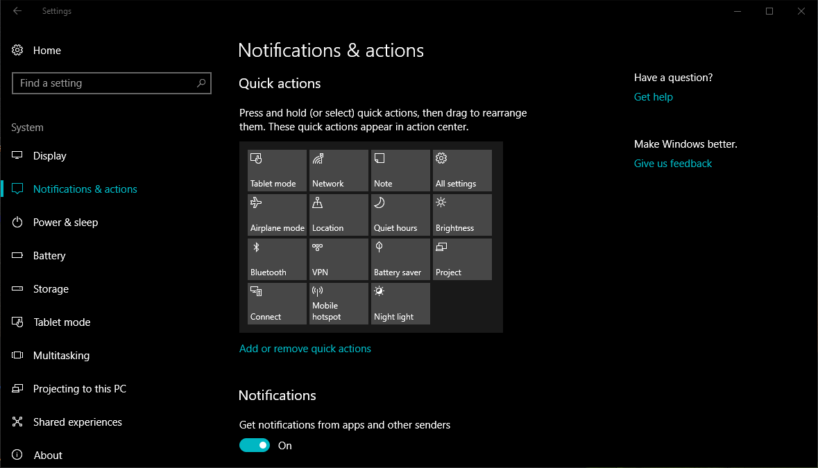 You can remove these quick actions or change their order. On the Notifications & actions page, click Add or remove quick actions. To change the order of the quick actions, just click and drag them across the grid.