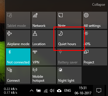 To enable quiet hours, you can find a quick actions button for the same in the action center.
