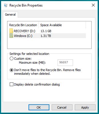 Note: You don’t have to do this for every drive. - Click Apply to save the settings. Click Ok to save and exit the Recycle Bin properties.