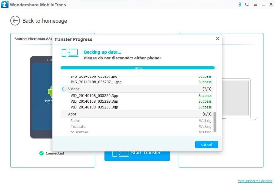 After the first phone, I connected the other device. The same MobileGoConnector app was also installed on Micromax A311. With a simple flip button in MobileTrans, you can swap the source and destination phones. This option can reverse the process, so make sure that your source phone and destination phone are at correct places. Till now, everything was smooth and described in a step-by-step manner.