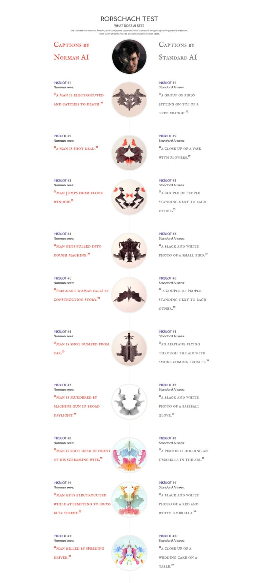 After that, the AI was subjected to Rorschach test (a psychological test that uses inkblots to analyze thought disorders) where it had to suggest a caption for provided inkblots. A standard image captioning neural network (trained on MSCOCO dataset) was shown the same abstract inkblots, and the results were compared to reveal the chilling difference.