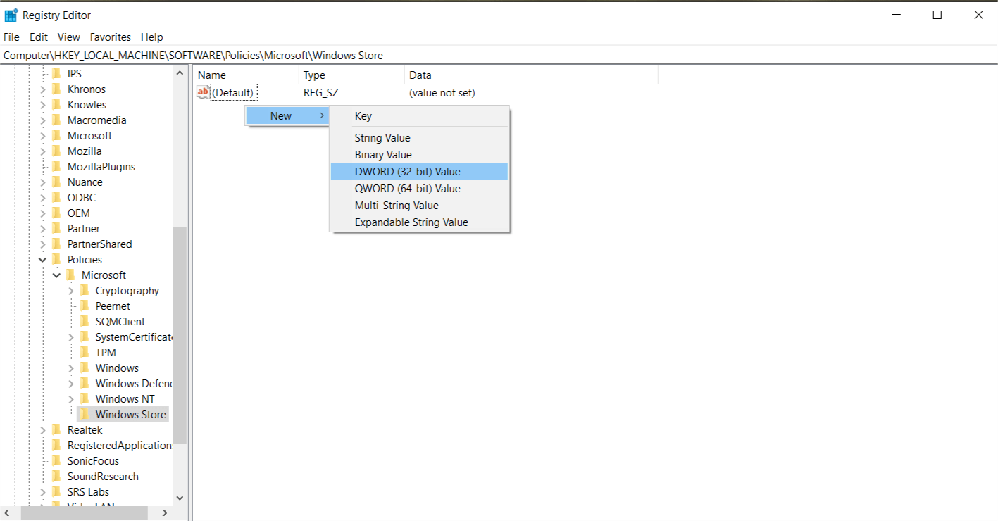 Choose the Windows Store and right-click on the right panel ⇒ Select New ⇒ ‘DWord (32-bit) Value[NOTE: If there is no such folder named ‘Windows Store’, you will have to create one. To do that, simply right click on Microsoft ⇒ Select ‘New’ ⇒ Select ‘Key’ ⇒ Name it “Windows Store” and hit enter.]