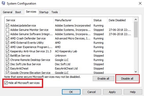 4. In the ‘Services’ tab, check “Hide all Microsoft services” and click on “Disable all.”